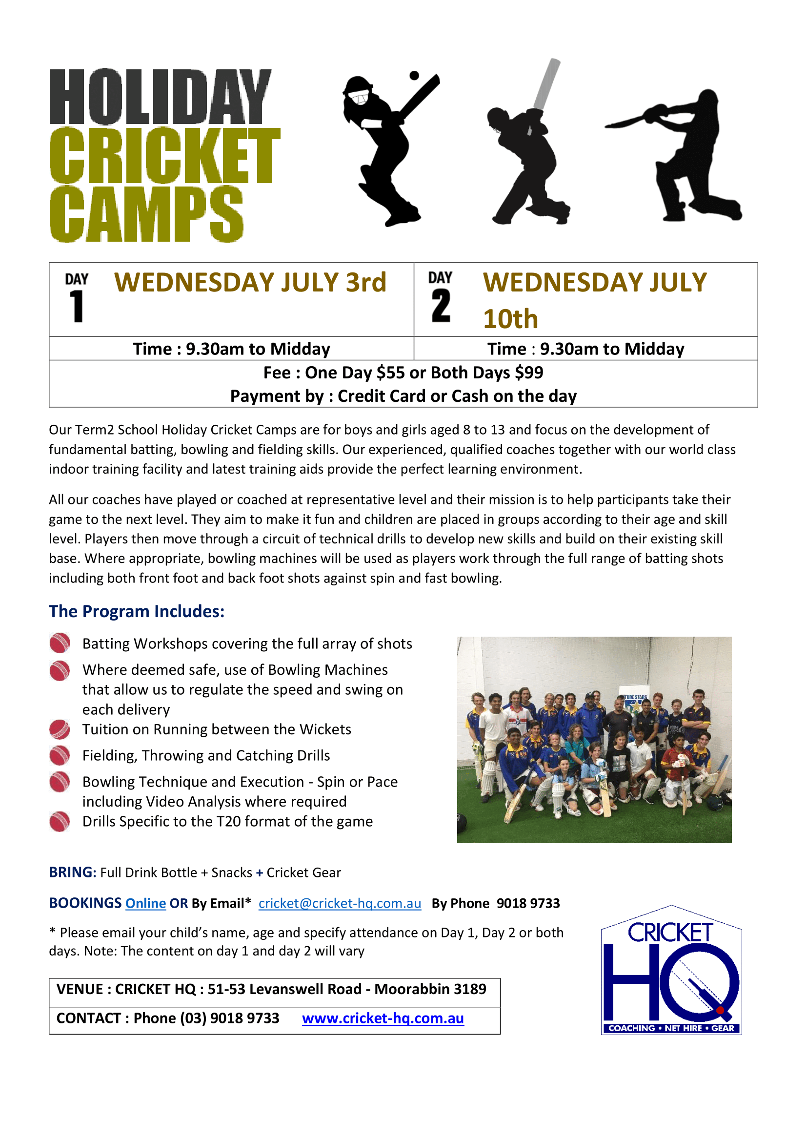 Our Term 2 School Holiday Cricket Camps are for boys and girls aged 8 to 13 and focus on the development of fundamental batting,